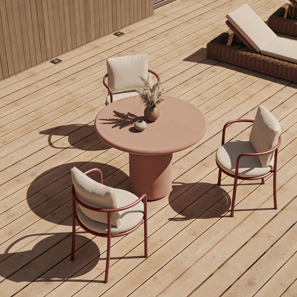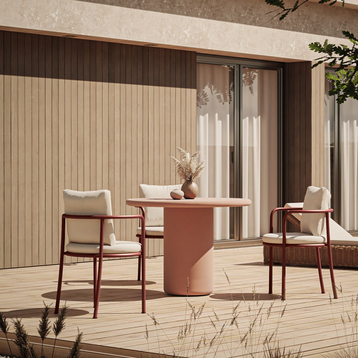 The Vibonis table in terracotta color is a true ornament for any garden. Elegant and durable, it perfectly blends with the natural environment, bringing lightness and harmony to the space. An ideal choice for modern arrangements.