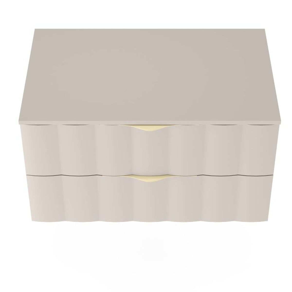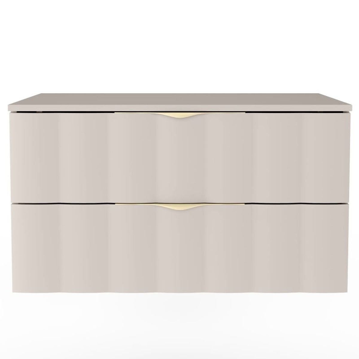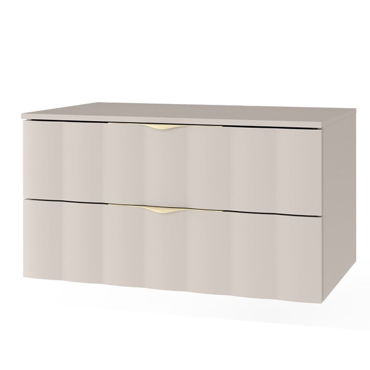 Elevate your bathroom's standard with the cashmere Omi cabinet featuring an elegant design and a wavy front panel. Two spacious drawers with soft-close mechanism and brushed gold handles ensure perfect organization.