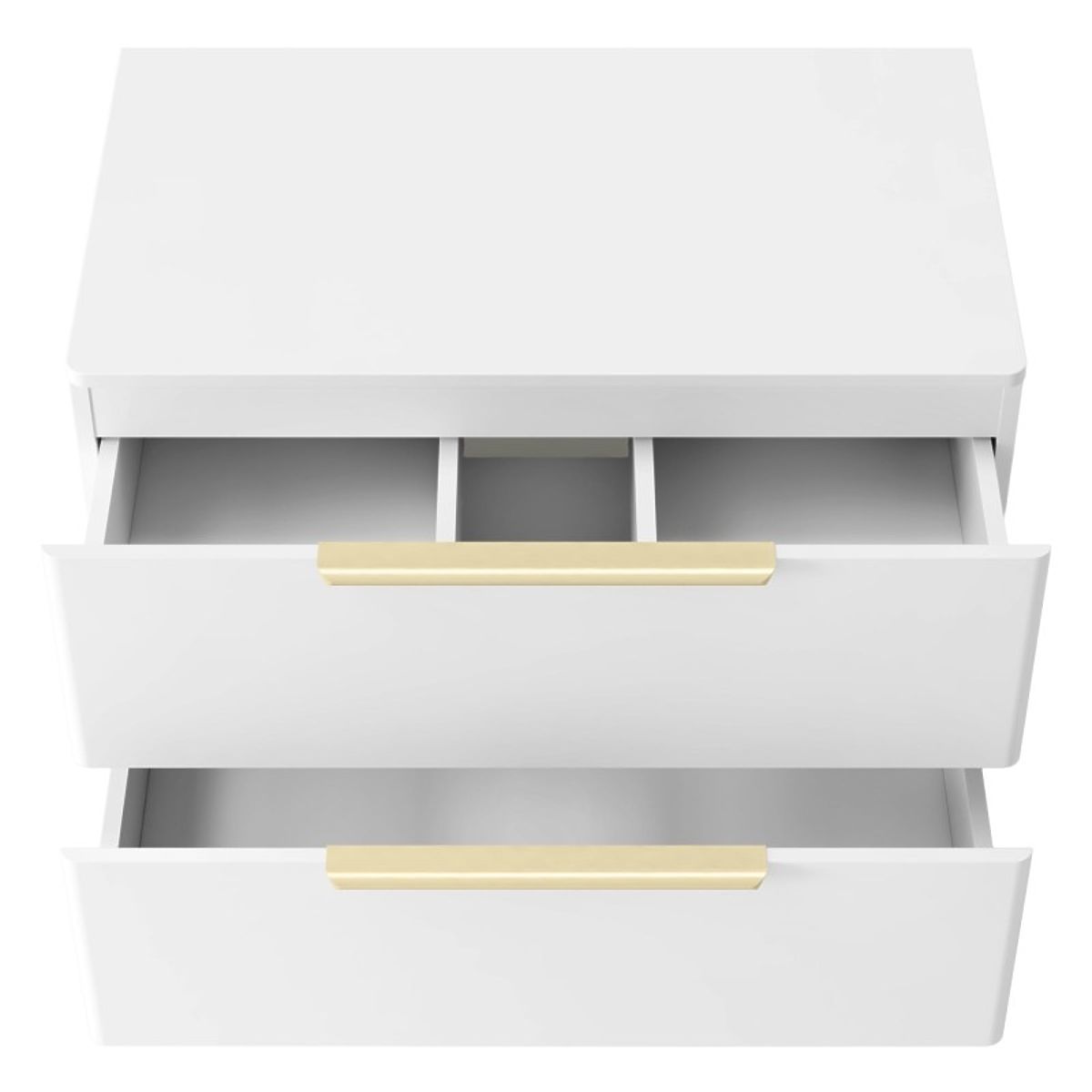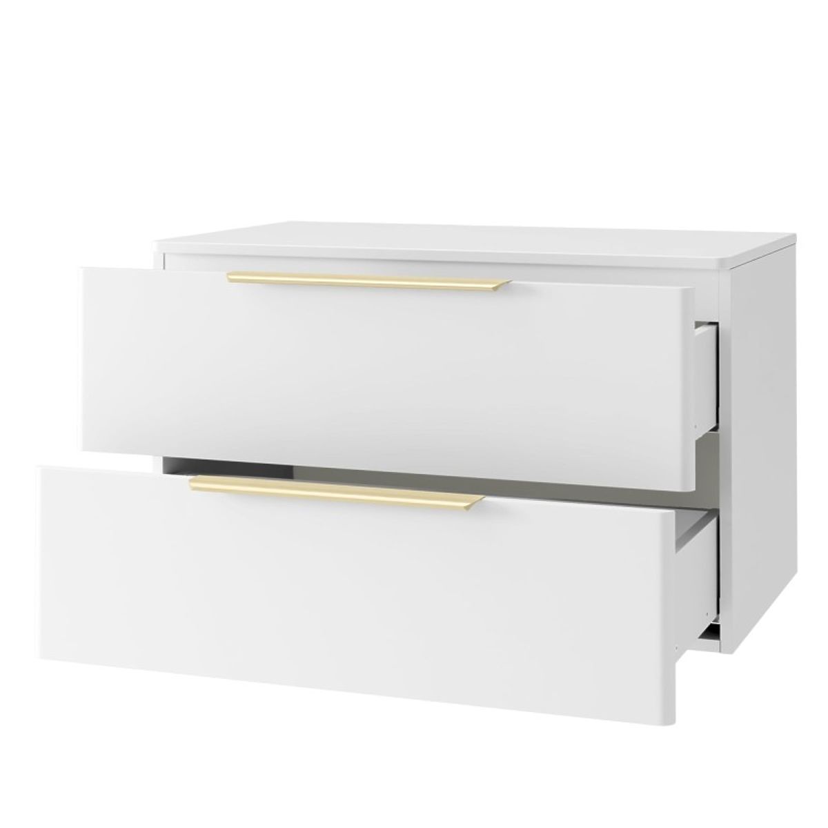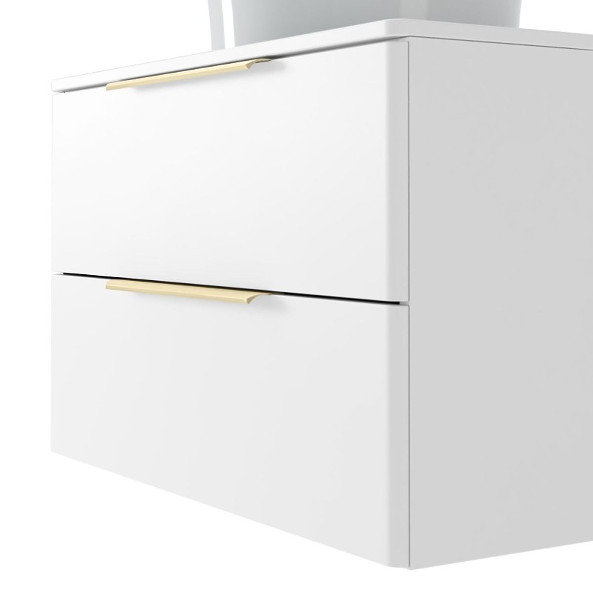 White vanity cabinet with gold handles and soft-close drawers. .. more