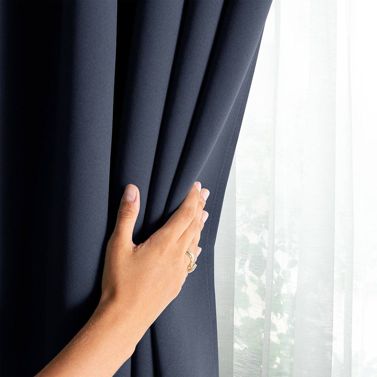 Indigo blackout curtain with silver eyelets and tieback. .. more