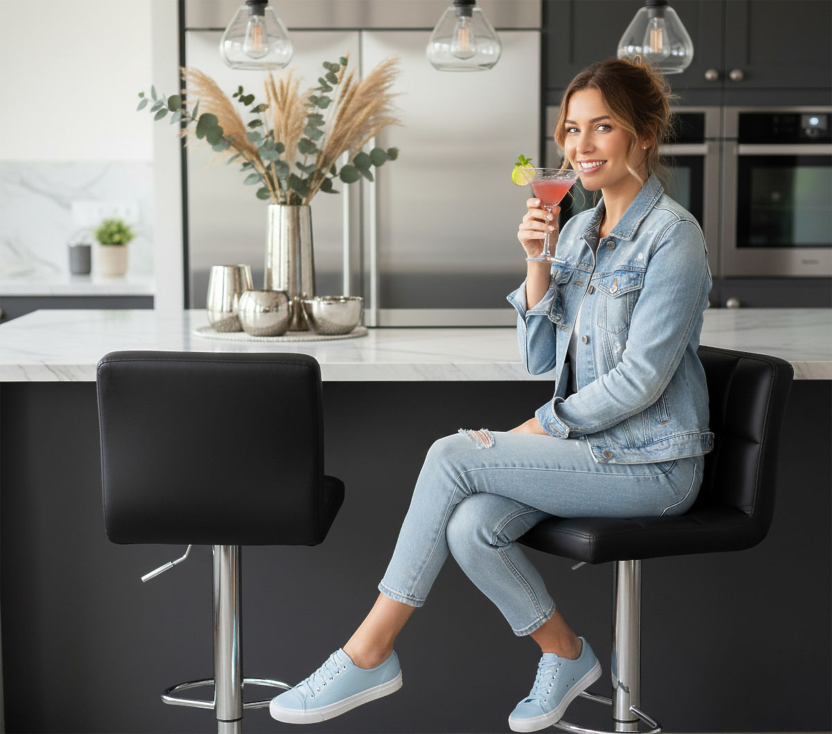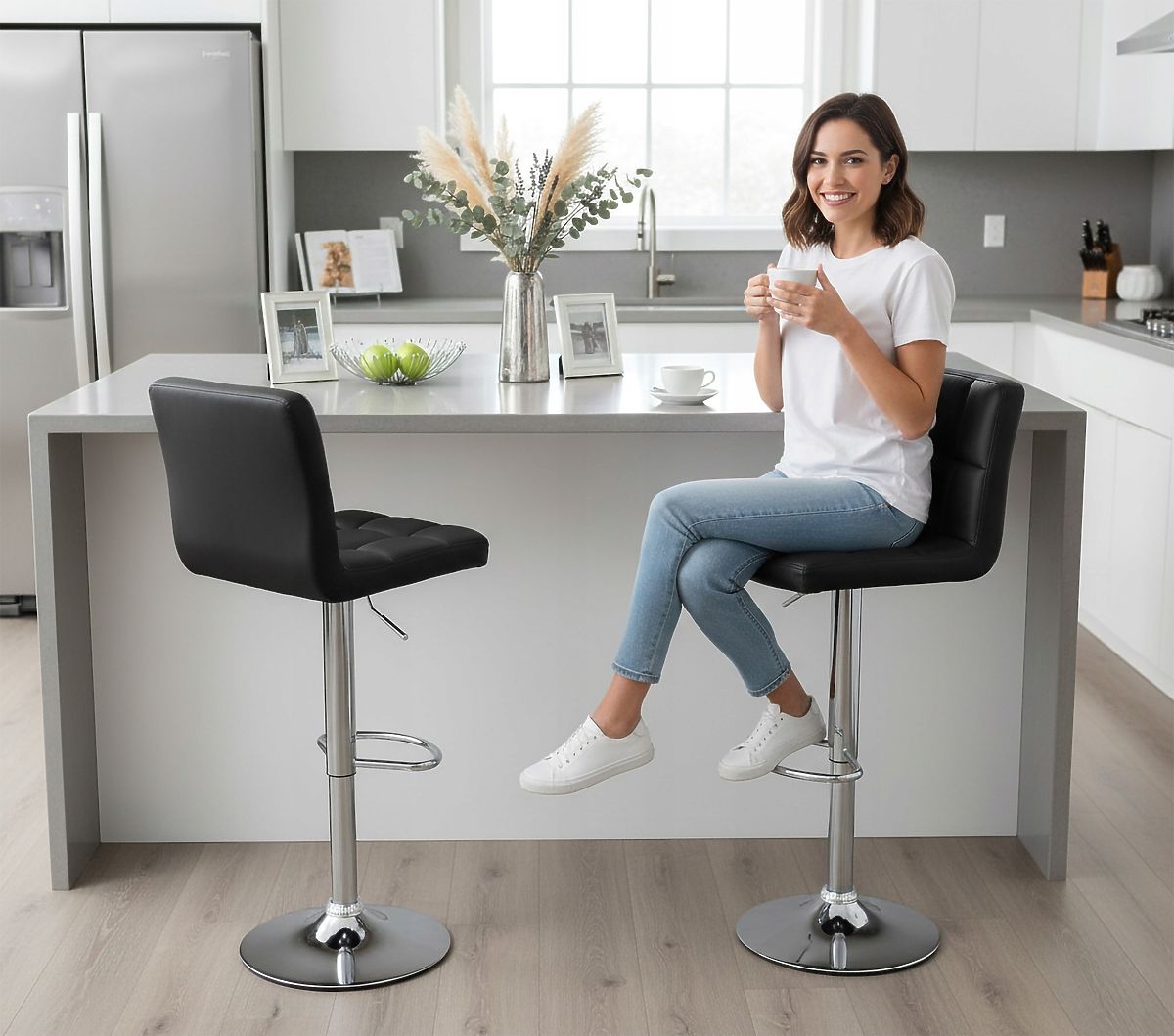 Arako Black Bar Stool Model: ARAKO | Color: Black ⭐️ Upholstered with eco-leather ⭐️ Comfortable seat ⭐️ Modern design ⭐️ Maximum load capacity 120 kg ⭐️ Purchase directly from the manufacturer The Italian design of the Arako stool continues to maintain its popularity. It's no wonder - the ideally shaped backrest and comfortable seat ensure very comfortable use. The chrome base conceals a telescopic lift and lever, which allow us to easily adjust the stool's height to our needs. We offer a manufacturer's warranty - 24 months. Advantages of the Arako stool ✅Interesting geometric stitching - The Arako stool is characterized not only by comfort and elegance but also by an original pattern on the seat, where interesting geometric stitching forms a quilted grid pattern, giving it an exceptional character. These details make the stool extremely impressive, making it an ideal addition to modern interiors. ✅Upholstered with soft eco-leather - high-quality upholstery provides pleasant, soft sensations during use. Its luxurious texture adds elegance and refined style to the interior. ✅Chrome elements - Chrome elements give the Arako stool a modern character and elegant finish, making it an extremely attractive element of interior design. Their surface complements the shiny upholstery, giving the entire construction an exclusive and modern look. ✅Height adjustment - The stool is equipped with the latest piston, allowing smooth seat height adjustment, ensuring the user optimal adaptation to the preferred position. This feature guarantees extraordinary comfort and allows the stool to be adjusted to different table heights. ✅360° swivel - The model provides full freedom of movement thanks to the swivel design, allowing the user to rotate 360 degrees. This feature allows easy movement around the table or bar without having to lift or move the entire stool. Technical product features ✅Seat covered with eco-leather ✅Chrome elements ✅Height adjustment ✅360-degree swivel ✅Non-slip base ✅Ergonomic footrest ✅Convenient lever for seat height adjustment ✅Time required for assembly: 1-2 min Product dimensions Maximum height: 107 cm Minimum height: 87 cm Maximum seat height: 83 cm Minimum seat height: 63 cm Base diameter: 38 cm Telescopic lift diameter: 50 mm Seat depth: 35 cm Seat width: 40 cm Backrest width: 40 cm Height from seat to backrest: 28 cm Additional information The displayed colors should be considered as indicative - they may differ from the actual ones due to various monitor settings and photo editing processes. Actual dimensions may differ from those listed above. Error tolerance may be +/- 5%. CAUTION | There is a protection (black cap) on the piston that must be removed before attaching the seat. Brand: eHokery Product code: 5907439170364(1) EAN code: 5902340307021 Color: Black Height: 107 cm Width: 40 cm Seat material: eco-leather Base material: metal Intended use: dining room | kitchen | living room | office | restaurant | bar Self-assembly: yes