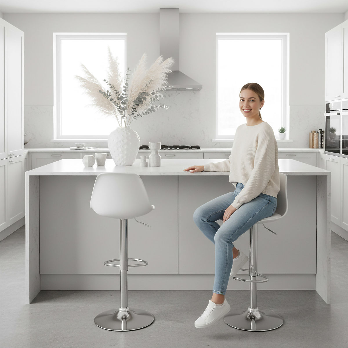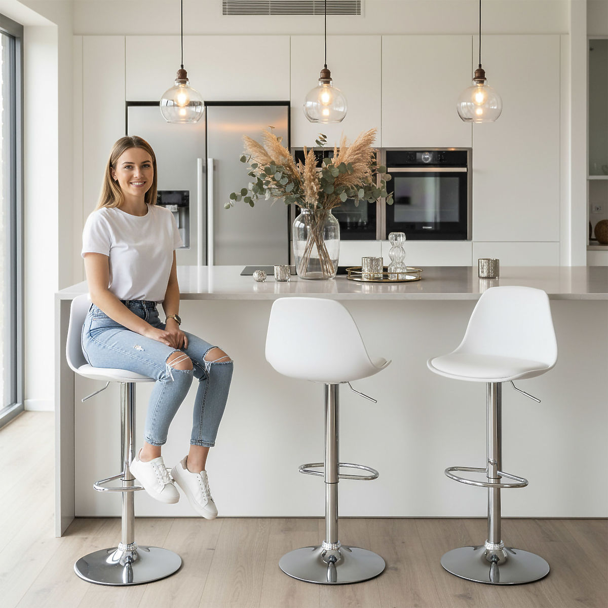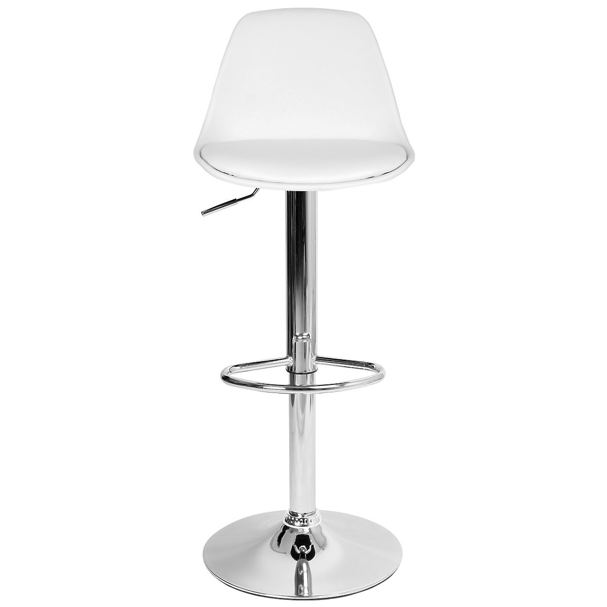 Ricardo White Bar Stool Model: RICARDO | Color: White ⭐️ Comfortable seat with cushion ⭐️ Adjustable height ⭐️ 360-degree swivel ⭐️ Maximum load capacity 120 kg ⭐️ Purchase directly from the manufacturer The Ricardo bar stool is the perfect combination of style and practicality. Its modern design brings elegance to any interior, and features like a swivel seat and adjustable height ensure comfort during use. It fits perfectly in the kitchen, suitable for use at counters, bars, or kitchen islands. The stable, chrome-plated construction and easy maintenance ensure it meets the expectations of even the most demanding individuals. Product Features Seat upholstered in eco-leather Chrome elements Adjustable height 360-degree swivel Non-slip base Ergonomic footrest Convenient handle for seat height adjustment Assembly time: 1-2 minutes Product Dimensions Maximum height: 103 cm Minimum height: 83 cm Maximum seat height: 82 cm Minimum seat height: 61 cm Base diameter: 38 cm Telescopic lift diameter: 50 mm Seat depth: 33 cm Seat width: 38 cm Backrest height: 24 cm Backrest width: 35 cm Additional Information The displayed colors are indicative - they may differ from the actual ones due to different monitor settings and photo editing processes. Actual dimensions may vary from those listed above. Error tolerance may be +/- 5%. ATTENTION | There is a protection (black cap) on the piston that must be removed before attaching the seat. Brand: eHokery EAN code: 5902340307489 Color: White Height: 83-103 cm Width: 38 cm Seat material: Plastic + eco-leather Base material: Metal Intended use: Dining room | Kitchen | Living room Self-assembly: Yes