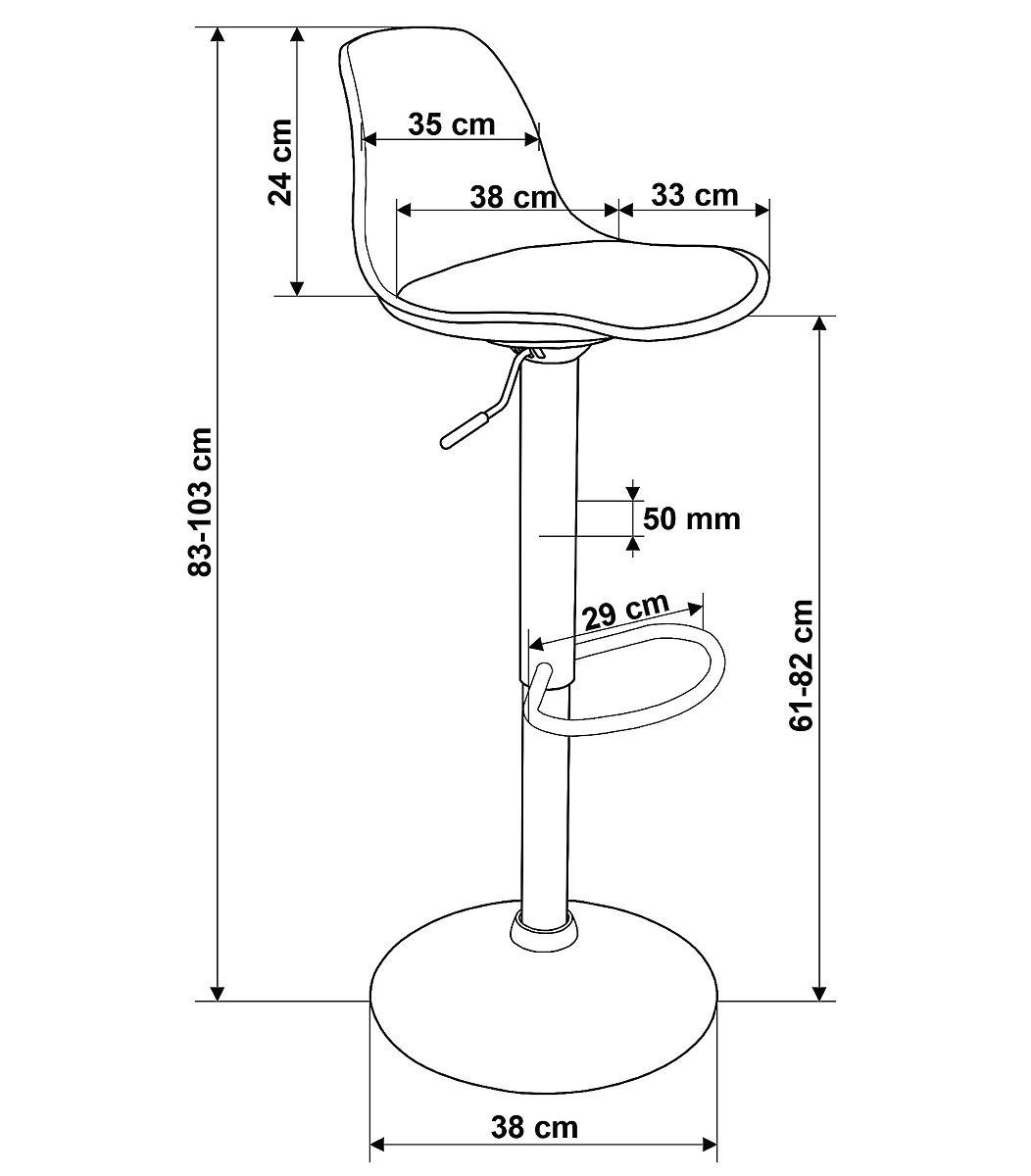 Ricardo Black Bar Stool ⭐️ Comfortable seat with cushion ⭐️ Adjustable height ⭐️ 360-degree swivel ⭐️ Maximum load 120 kg ⭐️ Purchase directly from the manufacturer Modern and comfortable bar stool with a contoured backrest enhancing user comfort. Italian design fits any space. Perfect for modern kitchens, restaurants, bars, exclusive shops, beauty salons, elegant offices, trade show booths, and information points. By purchasing from us, you buy directly from the importer! Product Features Seat covered with eco-leather Chromed elements Adjustable height 360-degree swivel Non-slip base Ergonomic footrest Convenient handle for adjusting seat height Assembly time: 1-2 minutes Product Dimensions Maximum height: 103 cm Minimum height: 83 cm Maximum seat height: 82 cm Minimum seat height: 61 cm Base diameter: 38 cm Telescopic lift diameter: 50 mm Seat depth: 33 cm Seat width: 38 cm Backrest height: 24 cm Backrest width: 35 cm Key Features 360° swivel Adjustable height Convenient handle for adjusting seat height Contoured backrest Plastic seat with eco-leather cushion Ergonomic footrest Foot and base in chrome color Non-slip base Quick and easy assembly Additional Information Displayed colors are indicative - they may differ from actual colors due to different monitor settings and photo editing processes. Actual dimensions may vary from those listed above. Error tolerance may be +/- 5%. WARNING | There is a protection (black plug) on the piston that must be removed before attaching the seat. Brand: eHokery EAN code: 5902340307496 Color: black Height: 83-103 cm Width: 38 cm Seat material: plastic + eco-leather Base material: metal Intended use: dining room | kitchen | living room | office | restaurant | bar Self-assembly: yes