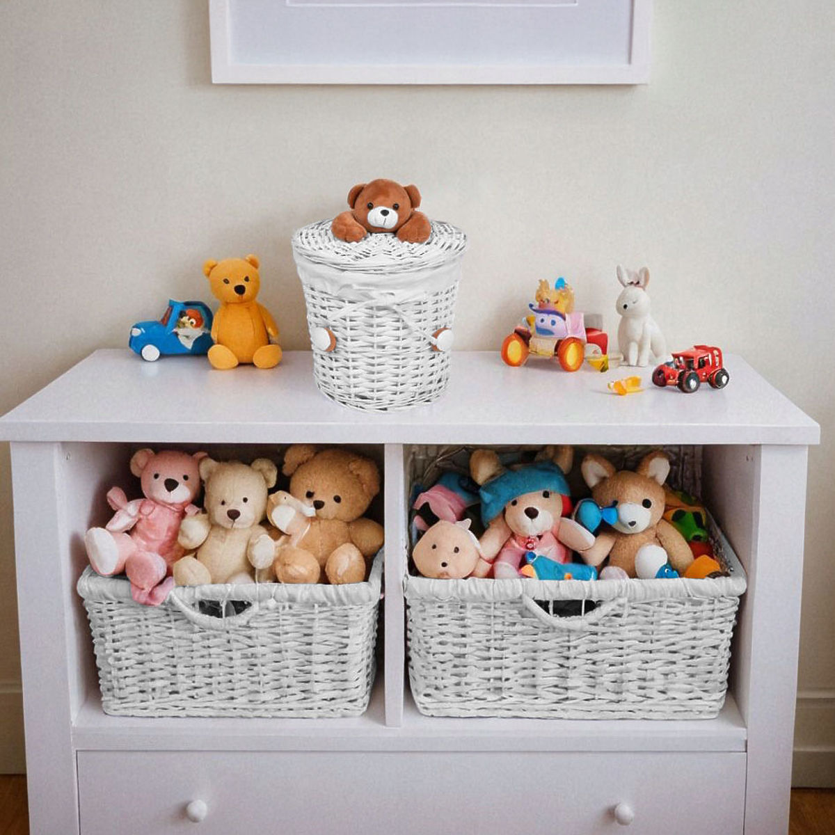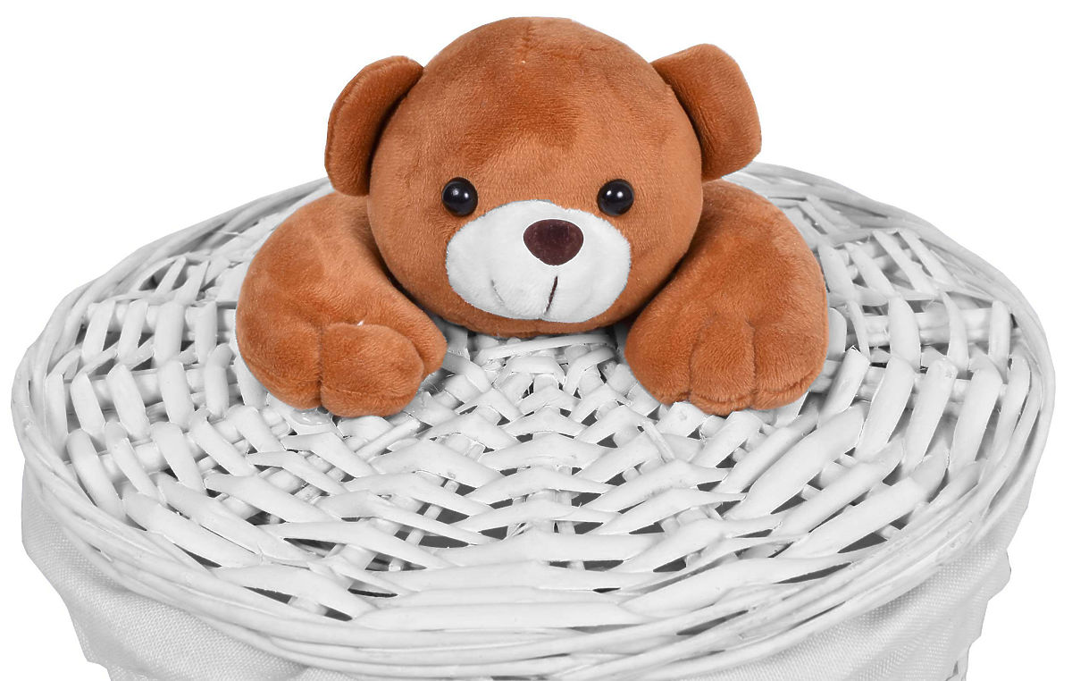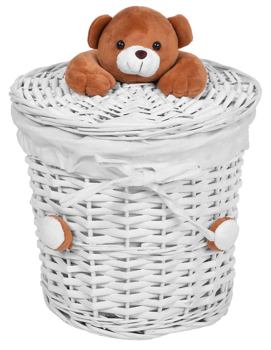 Wicker basket with a plush teddy bear Dimensions 28x28 cm The wicker basket is perfect as a toy or trinket basket in your child's kingdom. It is a very nice and aesthetic addition to any room. The product is made of wicker with even weaving, lined inside with a durable, cream-colored linen material. The lid features a plush teddy bear that is pleasant to the touch.